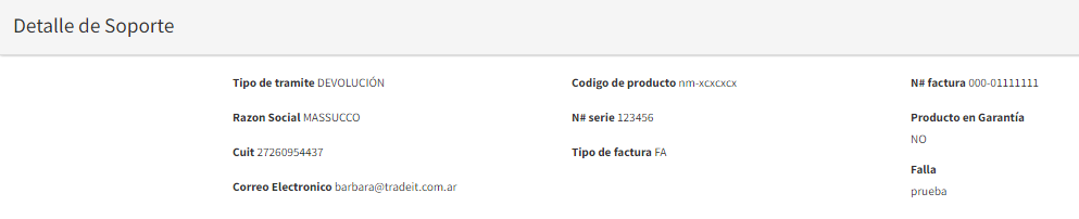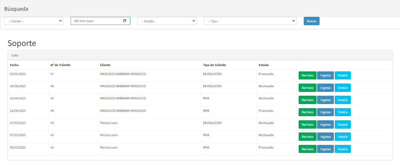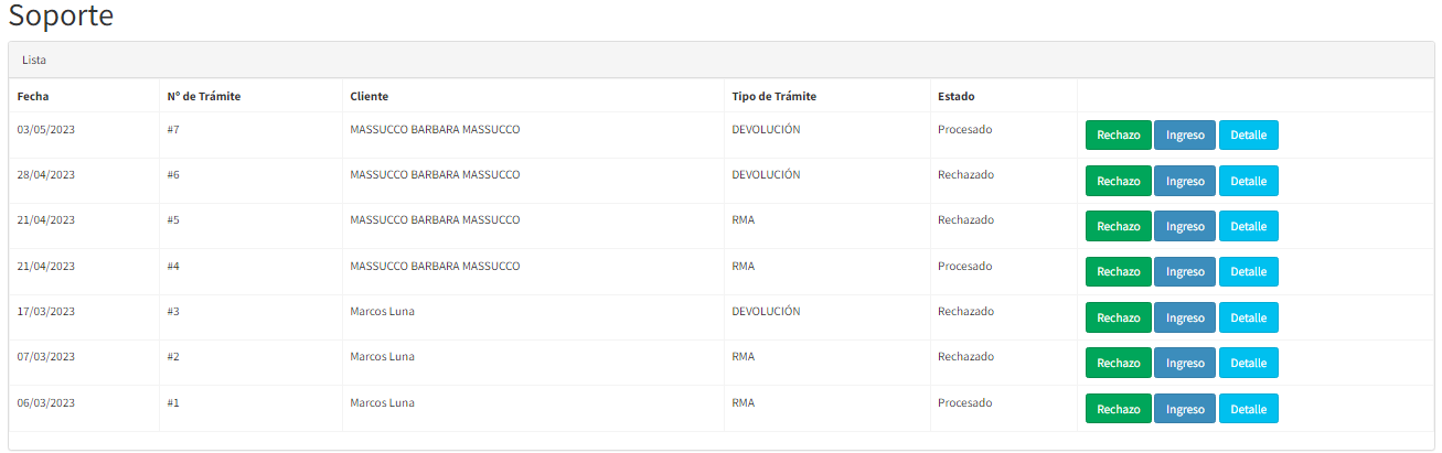 A su vez, en el apartado especifico de Soporte, se encuentran listados la información de los pedidos bajo los criterios de "Fecha", "Nº de Trámite", "Tipo de Trámite" y "Estado".