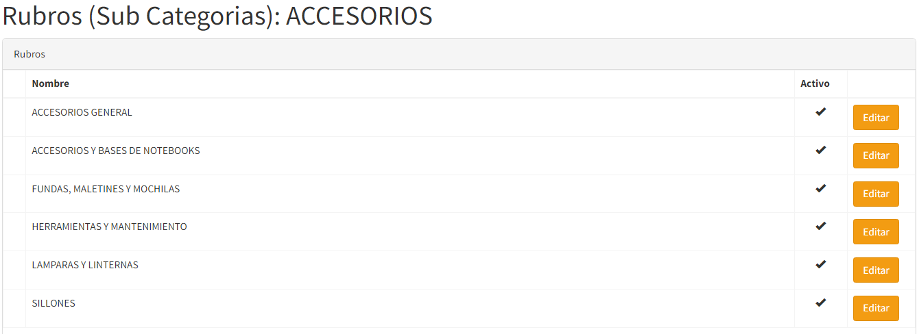 Sin embargo, en el margen derecho del modulo, en cada fila de rubros, veras dos botones: "SUB CATEGORIAS" Y "EDITAR", tal y como se ve en la imagen: